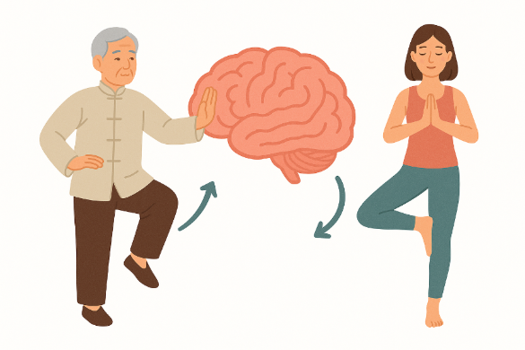 - โยคะ (Yoga) ผสมผสานการเคลื่อนไหวท่าทาง (อาสนะ) การควบคุมลมหายใจ (ปราณายาม) และการทำสมาธิ ผลการศึกษา: ช่วยด้านสมรรถภาพสมองโดยรวม ความจำระยะสั้น การคิดวางแผน และสมาธิ