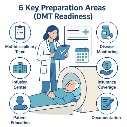 ข้อเสนอแนะเฉพาะสำหรับการเตรียมพร้อมรองรับยา DMTs ครอบคลุม 6 ด้านหลัก ได้แก่