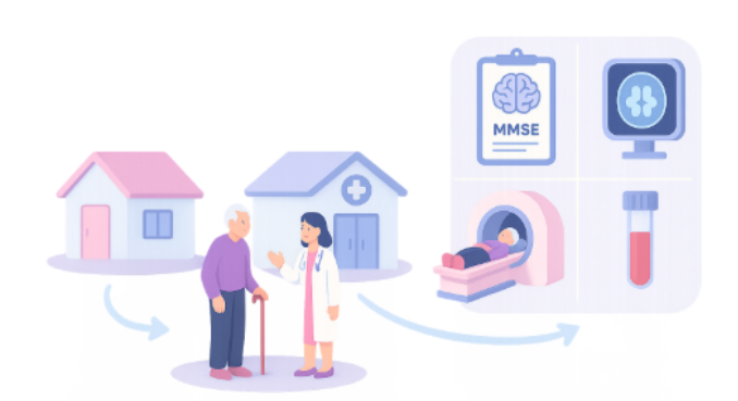 เมื่อผู้ป่วยมาพบแพทย์ กระบวนการตรวจวินิจฉัยจะเริ่มจากการซักประวัติโดยละเอียด โดยเน้นไปที่การทำงานของสมองในแต่ละด้าน การตรวจร่างกายทางระบบประสาท และการประเมินว่าอาการต่างๆ ส่งผลกระทบต่อการใช้ชีวิตประจำวันหรือไม่ แพทย์เกือบทุกคน (93%) ใช้แบบทดสอบ Mini-Mental State Examination (MMSE) เป็นเครื่องมือคัดกรองเบื้องต้น ส่วนแบบทดสอบ Montreal Cognitive Assessment (MoCA) ถูกใช้น้อยกว่า (66%) และถูกมองว่าเป็นทางเลือกในหลายประเทศ ยกเว้นเกาหลีที่มีการใช้แบบทดสอบที่ครอบคลุมมากขึ้น เช่น Seoul Neuropsychological Screening Battery
